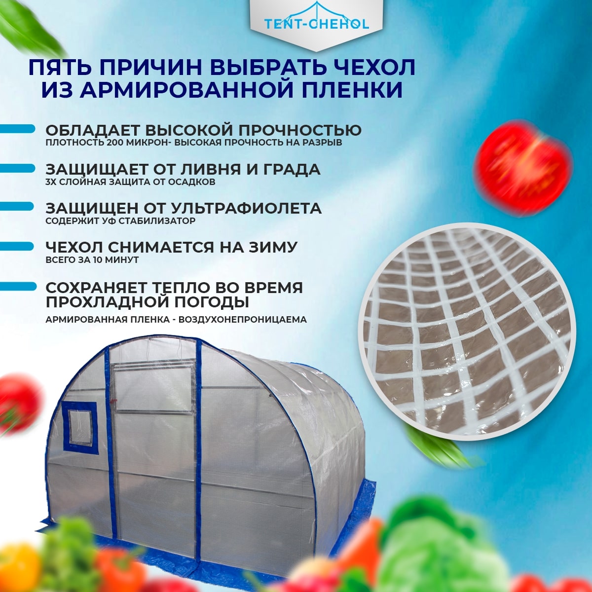 У нас вы можете купить чехол из армированной плёнки 2,10 х 3 х 4 м для теплицы. Из особенностей данного изделия можно выделить то, что ваша теплица не сломается под снегом, она может прослужить 3-5 лет, по сохранению тепла данный материал не уступает сотовому поликарбонату. Это абсолютно готовое изделие, которое просто нужно надеть на каркас теплицы, кроме того, его можно снять на зиму при необходимости. Данное изделие укомплектовано двумя дверьми на молнии, двумя форточками на липучках, предназначенными для вентиляции. Закрываются они максимально герметично, благодаря чему в теплице сохраняется тепло. Чехол может иметь разные размеры.