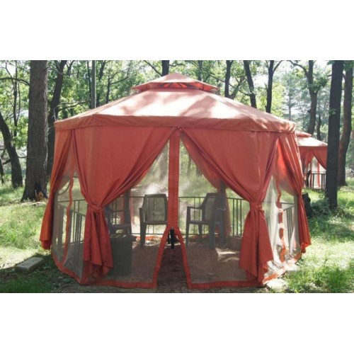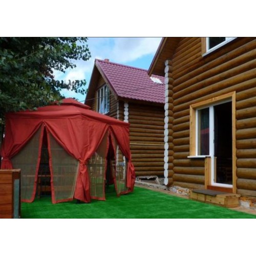 Шторы добавят эстетичности беседки, а так же защитят от атмосферных осадков, мелкодисперсной пыли, и ультрафиолета. Каждое из полотен оснащено застежкой-молнией. Москитные сетки представлены в коричневом цвете с элегантной окантовкой молочного оттенка. Антимоскитные полотна предупреждают проникновение насекомых, тополиного пуха.