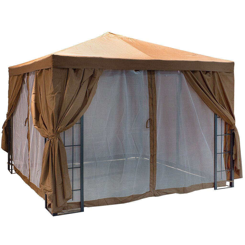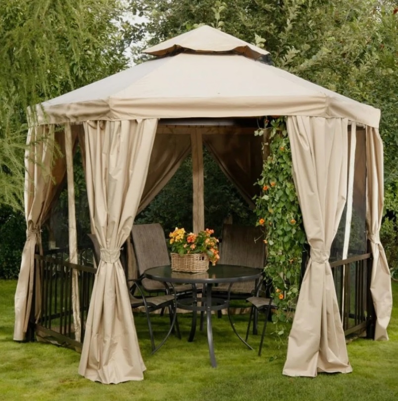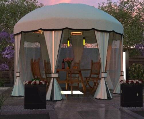 - Тентовый навес – отличная защита от трех главных негативных летних факторов: под ним не страшны докучливые насекомые, моросящий дождь и палящее солнце.